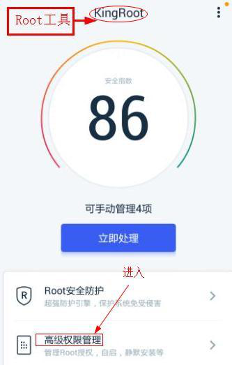 圖 3 :使用手機(jī)安裝的Root工具 ,如King Root(360超級(jí)Root亦可)進(jìn)入高級(jí)權(quán)限管 理
