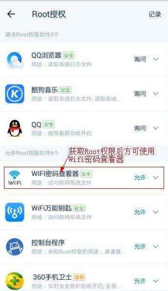 圖 5 :獲取ROOt權(quán)限后方可在手機(jī)上安裝和使用Wifi密碼查看器,設(shè)置允許便可