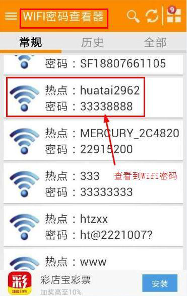 圖 6:在手機(jī)上的Wifi密碼查看器上查看到已連接的Wifi熱點(diǎn)的密碼